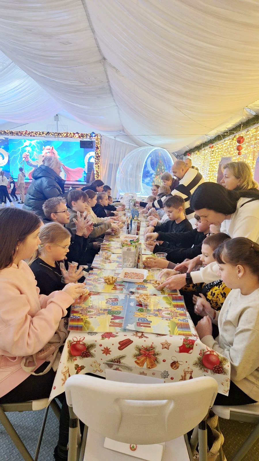 Наши ребята погрузились в атмосферу зимней сказки, встретились с любимыми героями. Их ожидали весёлые приключения, дискотека, бумажное шоу и увлекательный мастер - класс по приготовлению сладких трайфлов.